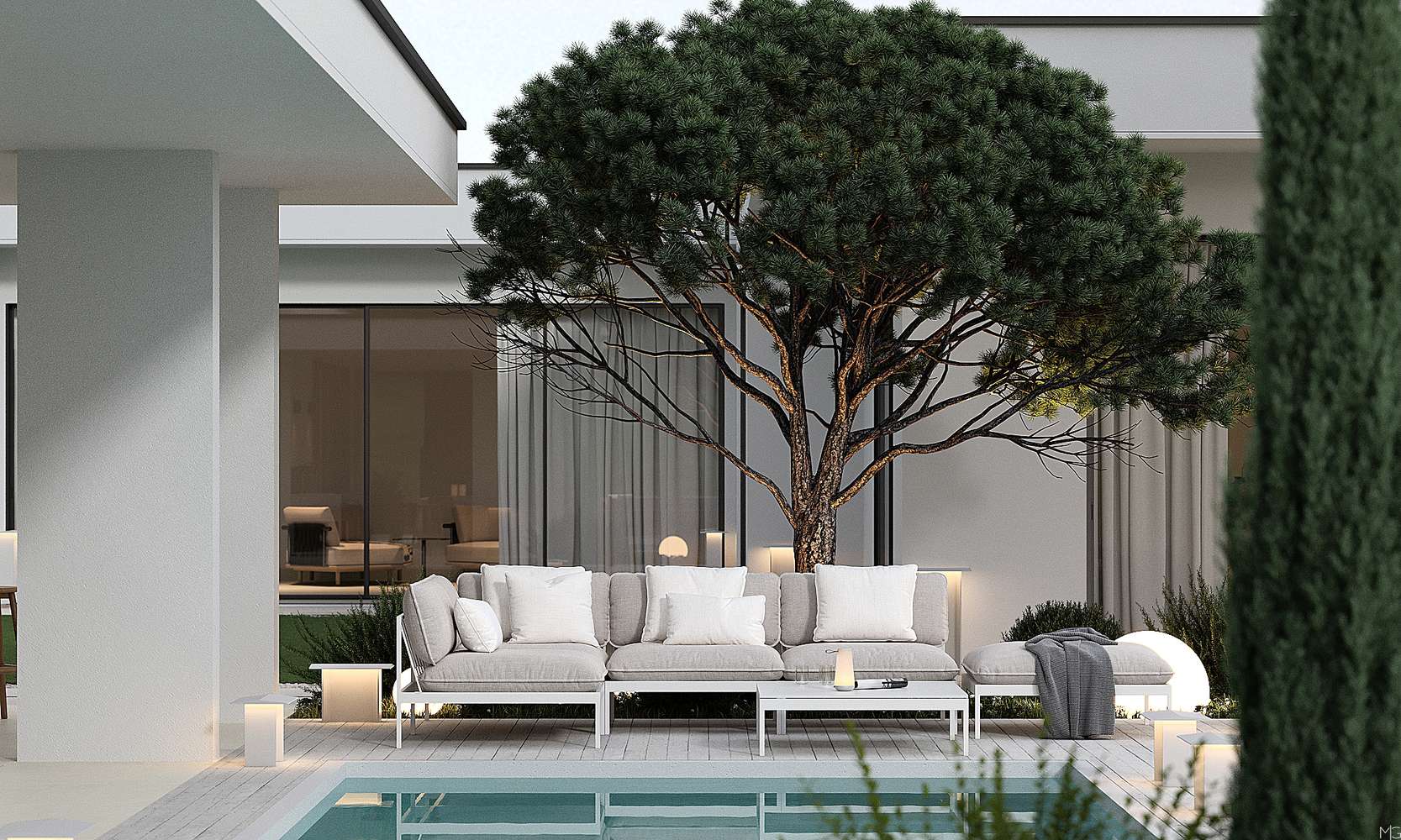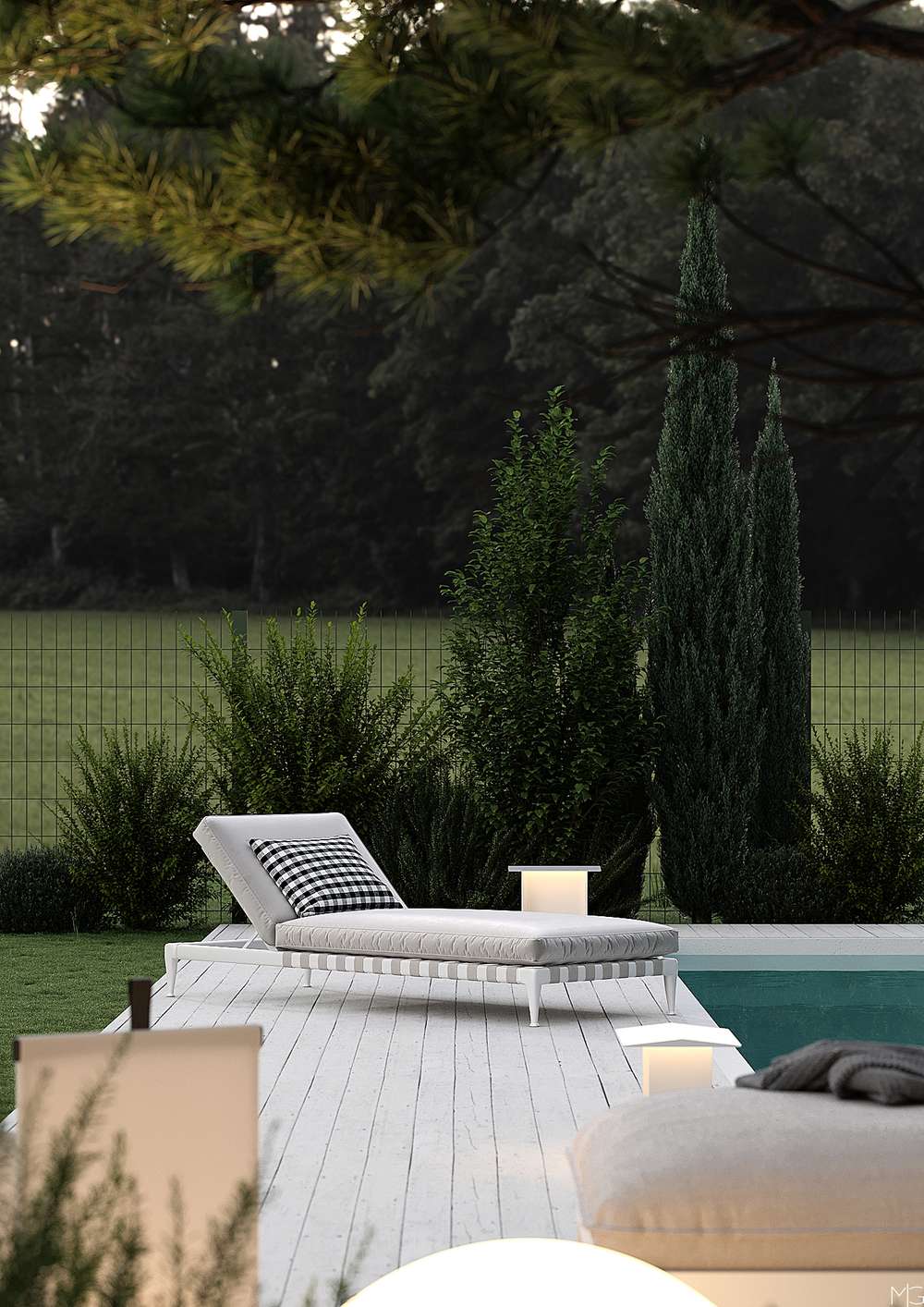 Бассейн и зона лежаков – сочетает в себе комфортное место для релаксации у воды, а водная гладь в современном дизайне, гармонично вписана в ландшафт. Зеленые насаждения, деревья и декоративные растения, создают атмосферу полного уюта, отдыха и комфорта.