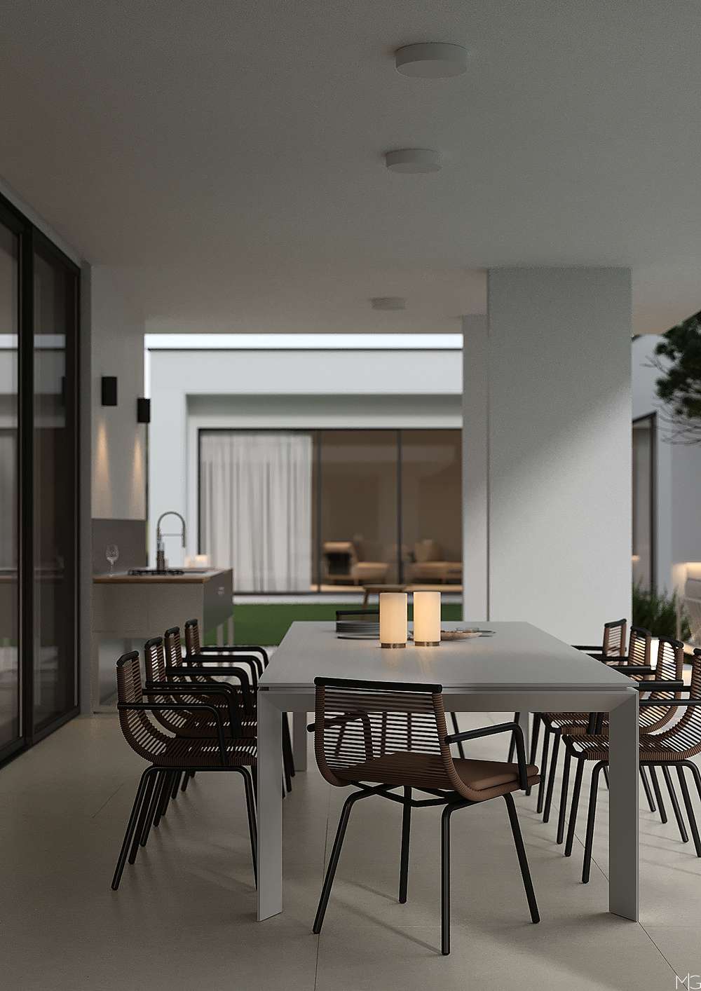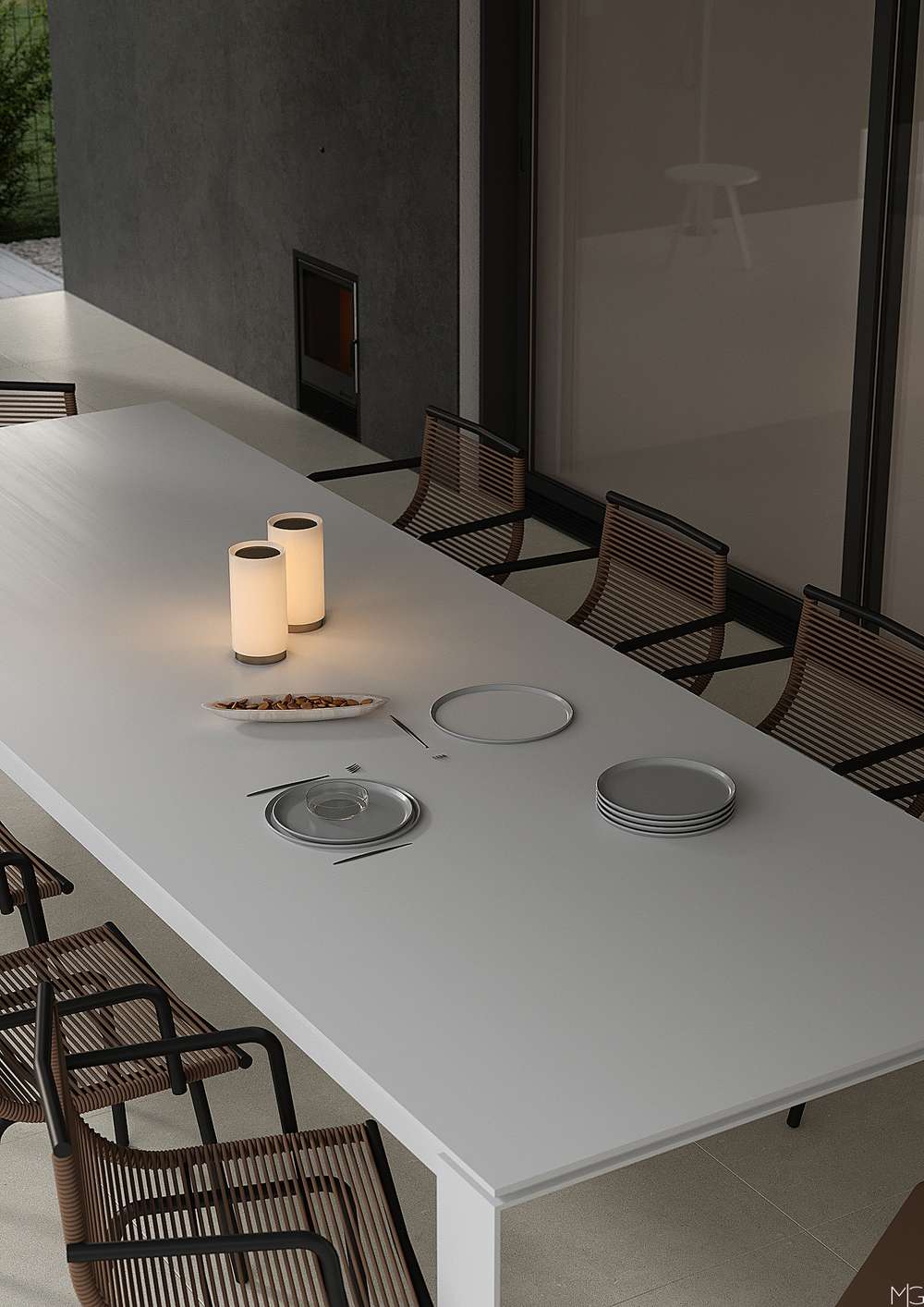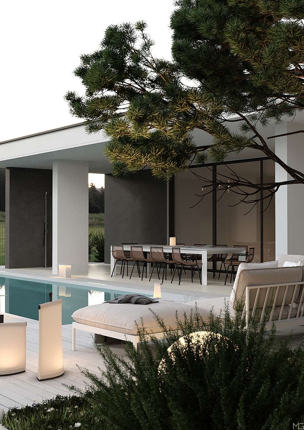 Обеденная зона – просторный стол на 10 человек, идеальный для ужинов на свежем воздухе.