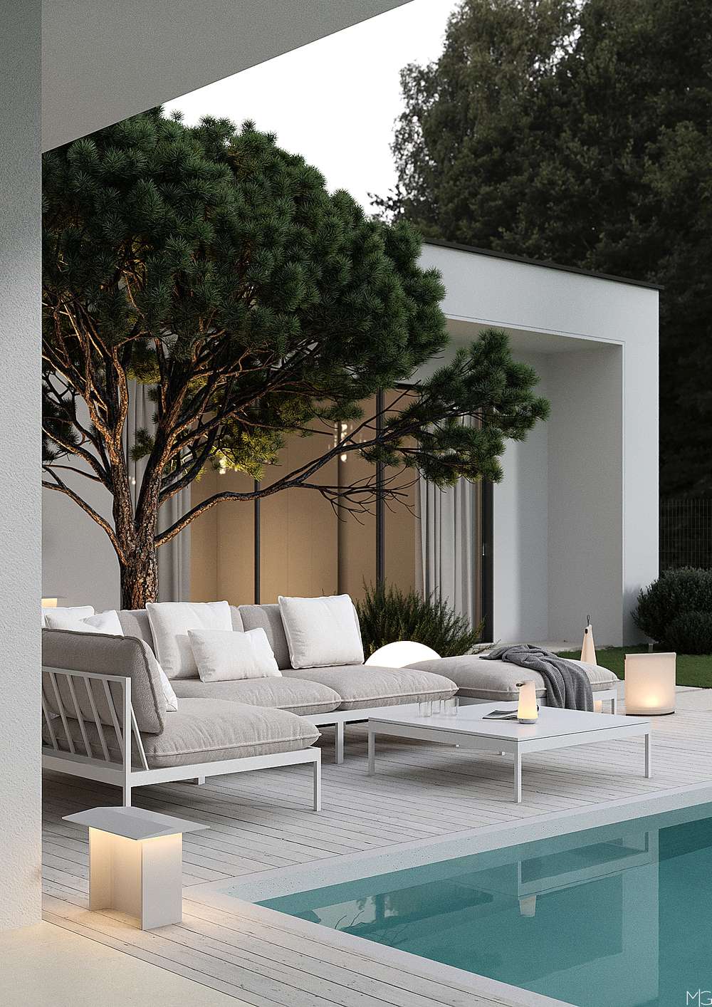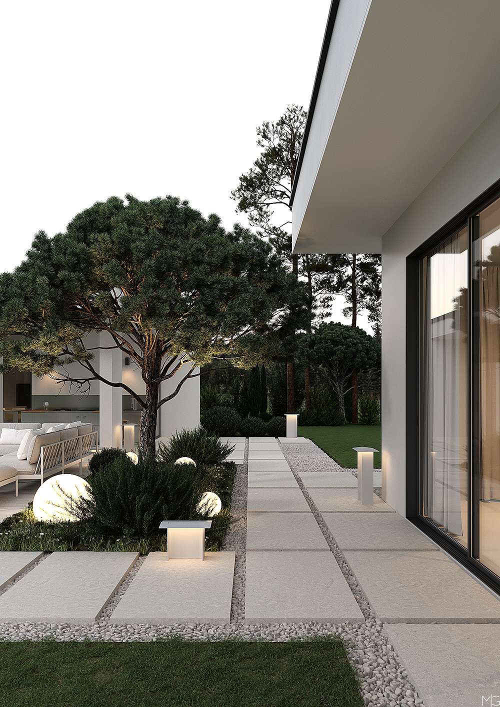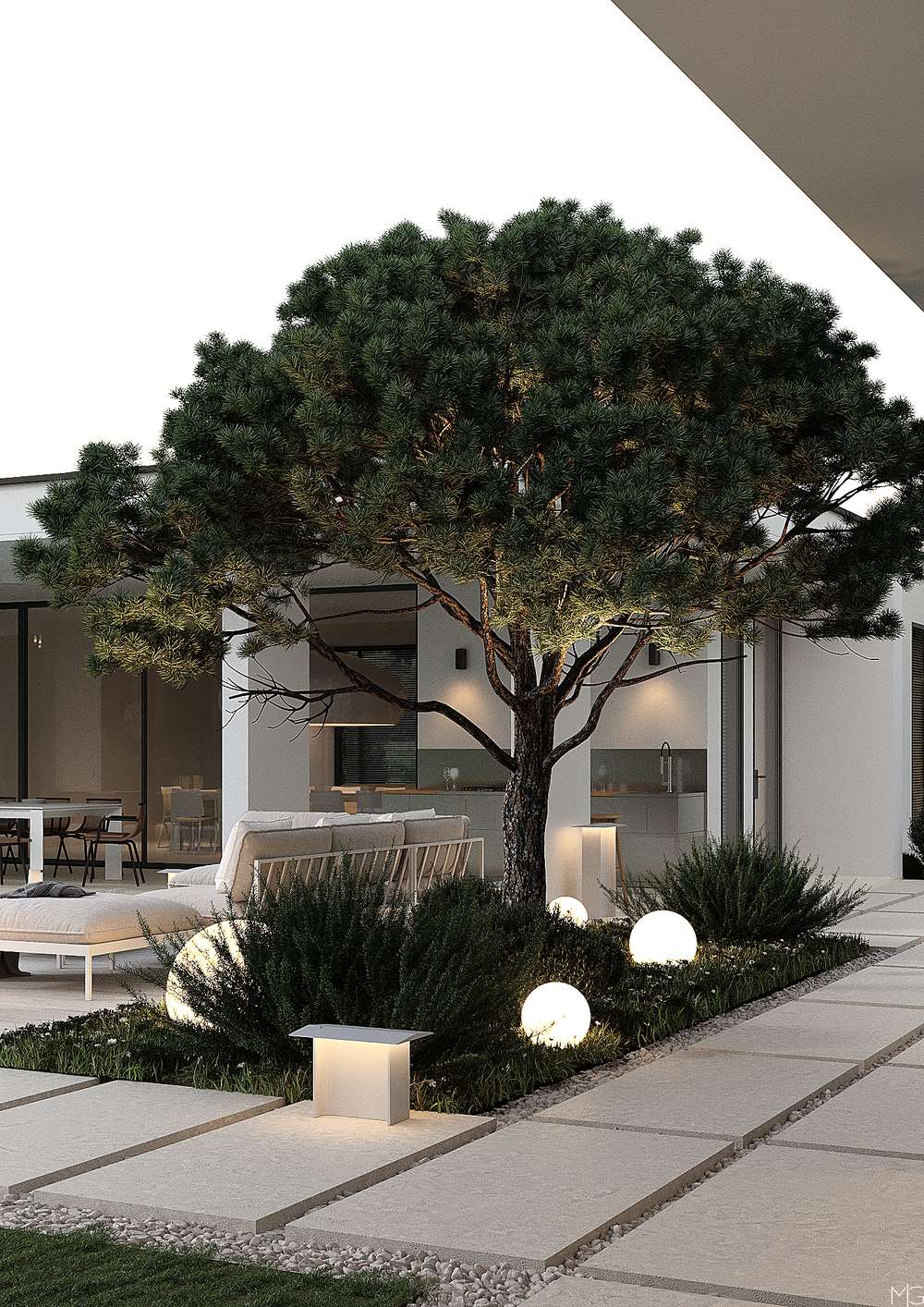 Четкие линии, гармония форм, контраст черного и белого, натуральные материалы и продуманное освещение делают этот проект идеальным местом в любое время года.