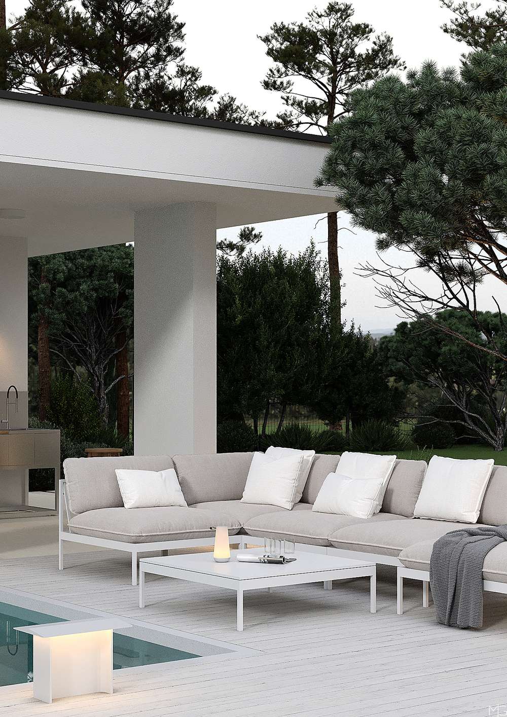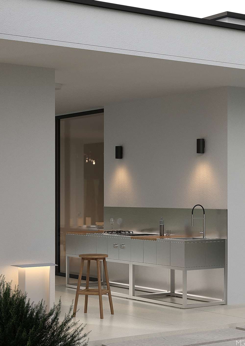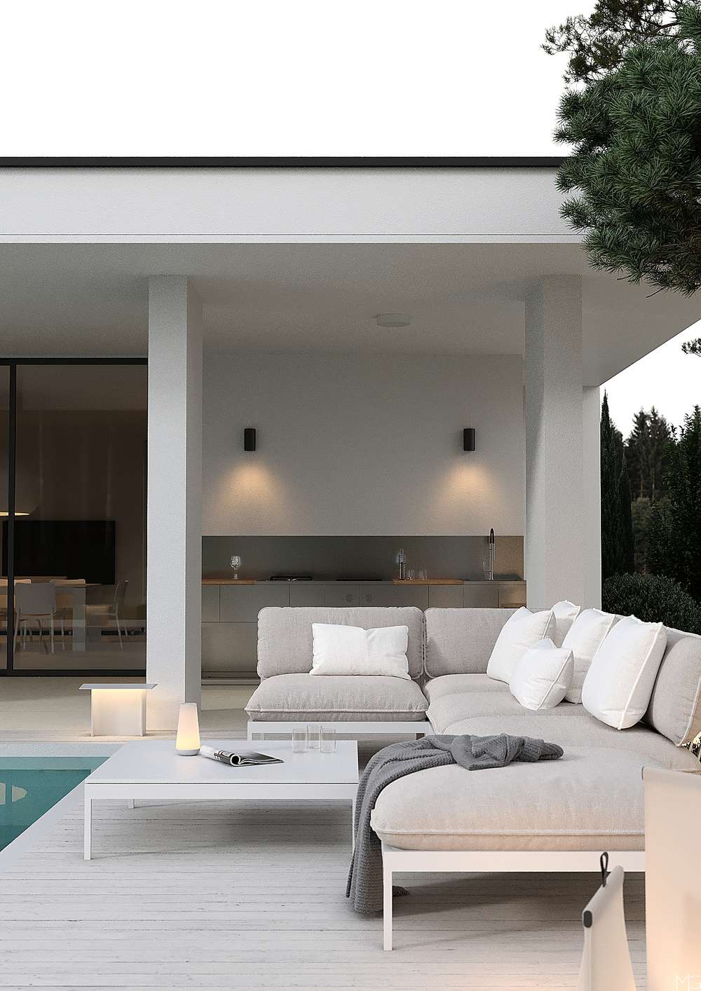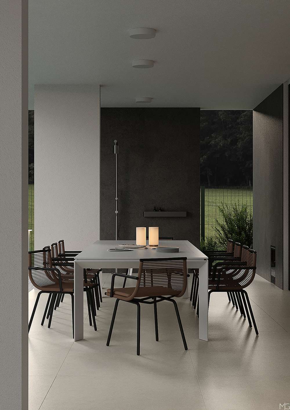 Четкие линии, гармония форм, контраст черного и белого, натуральные материалы и продуманное освещение делают этот проект идеальным местом в любое время года.